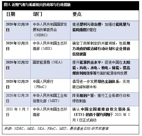 过去的数十年见证了中国坚定不移地贯彻五年计划,落实国家环境目标的决心。我们预计在未来,为实现碳中和目标,全国将制定更系统的政策措施,并在国家和地方层面、以及企业层面推行(图5)。毋庸置疑,低碳行业和技术的遍地开花将迎来海量的投资机遇。我们将在之后发布的研究洞见中继续探讨中国碳中和带来的投资机遇。