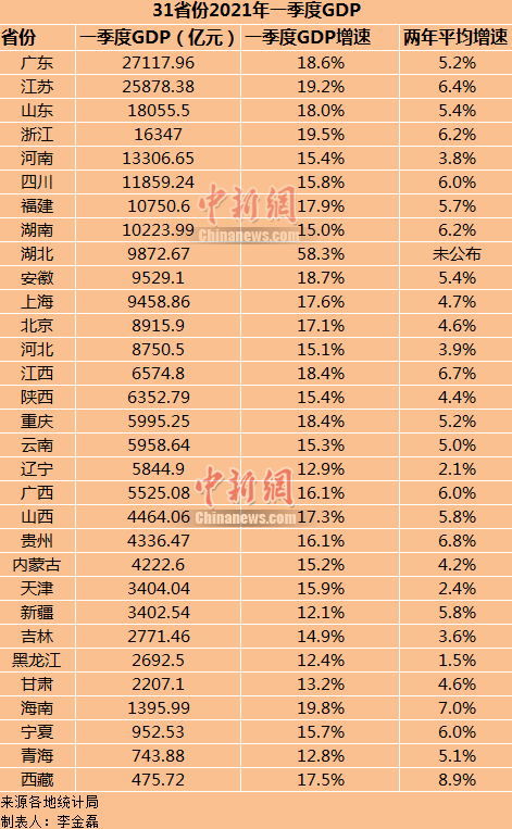 31省份一季度GDP增速均为两位数,湖北以58.3%的增速排第一;8个省份GDP增速跑赢了全国GDP增速;两年平均增速方面,西藏排名第一。广东一季度GDP总量超过2.7万亿元,排名第一。安徽一季度GDP赶超上海,挤进全国十强。