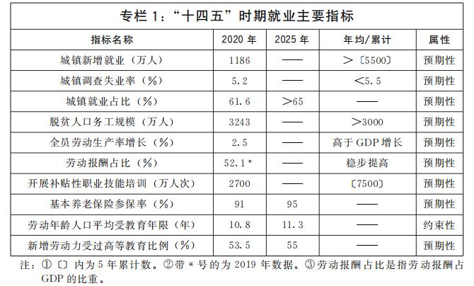 ——就业形势总体平稳。城镇新增就业5500万人以上,努力实现更大规模,城镇调查失业率控制在5.5%以内,重点群体就业保持稳定。城乡、区域就业机会差距逐步缩小,劳动力市场供求基本平衡。