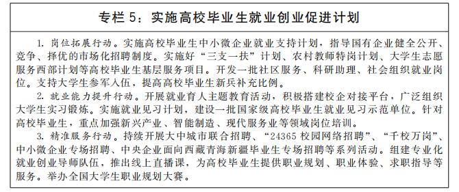 拓宽高校毕业生市场化社会化就业渠道。结合国家重大战略布局、现代产业体系建设、中小企业创新发展,创造更多有利于发挥高校毕业生专长和智力优势的知识技术型就业岗位。健全激励保障机制,畅通成长发展通道,引导高校毕业生到中西部、东北、艰苦边远地区和城乡基层就业。围绕乡村振兴战略,服务乡村建设行动和基层治理,扩大基层教育、医疗卫生、社区服务、农业技术等领域就业空间。为有意愿、有能力的高校毕业生创新创业提供资金、场地和技术等多层次支持。