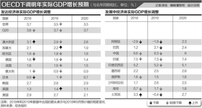 在报告中,OECD下调了大多数主要经济体明年的经济预期,将2019年全球整体经济增速下调至3.5%——低于去年5月3.7%的预测,并认为2020年将维持3.5%的增速。