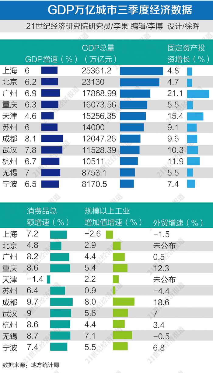 这些GDP过万亿俱乐部城市前三季度经济表现如何?21世纪经济研究院从GDP总量和增速、固定投资增速、消费增速、工业增速以及外贸增速六个维度进行对比,对中国经济的“头部城市”的发展质量进行对比分析。