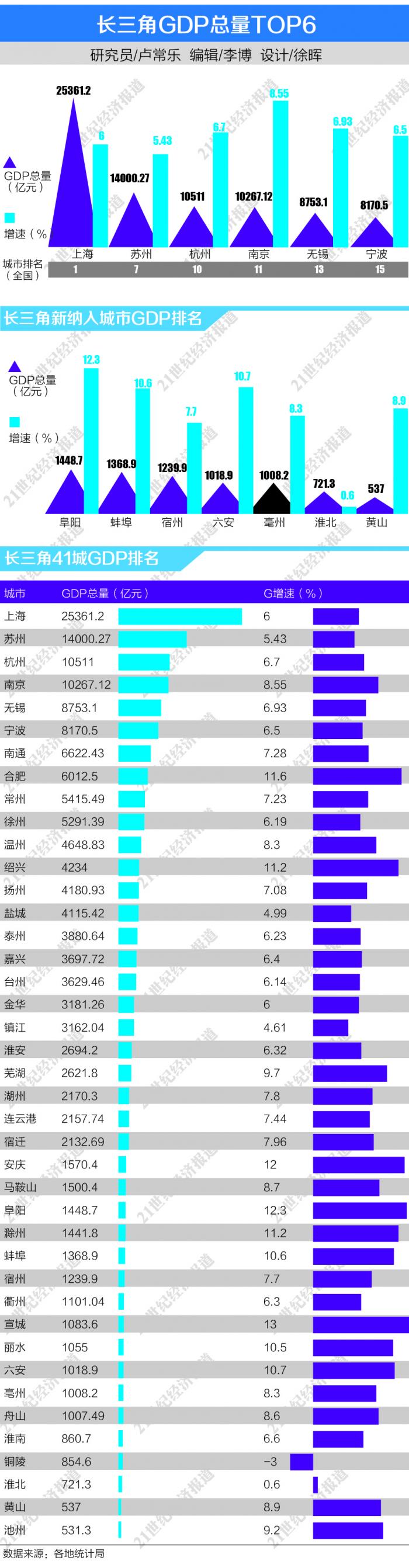 21世纪经济研究院研究员发现,上述新纳入的城市中,农业生产结构优化、工业效益持续改善,如电子信息业的强势增长,单位能耗的下降,是其保持经济中高速增长的关键。从总体上来看,新纳入城市的经济总量上虽仍有较大差距,如淮北、黄山经济总量不到千亿元,但是加入长三角一体化国家战略后,必然也会带来如成本节省、人才引进、交通基建等经济发展要素水平的提升。因此在未来的发展过程中,新纳入的城市仍有较大的发展潜力。