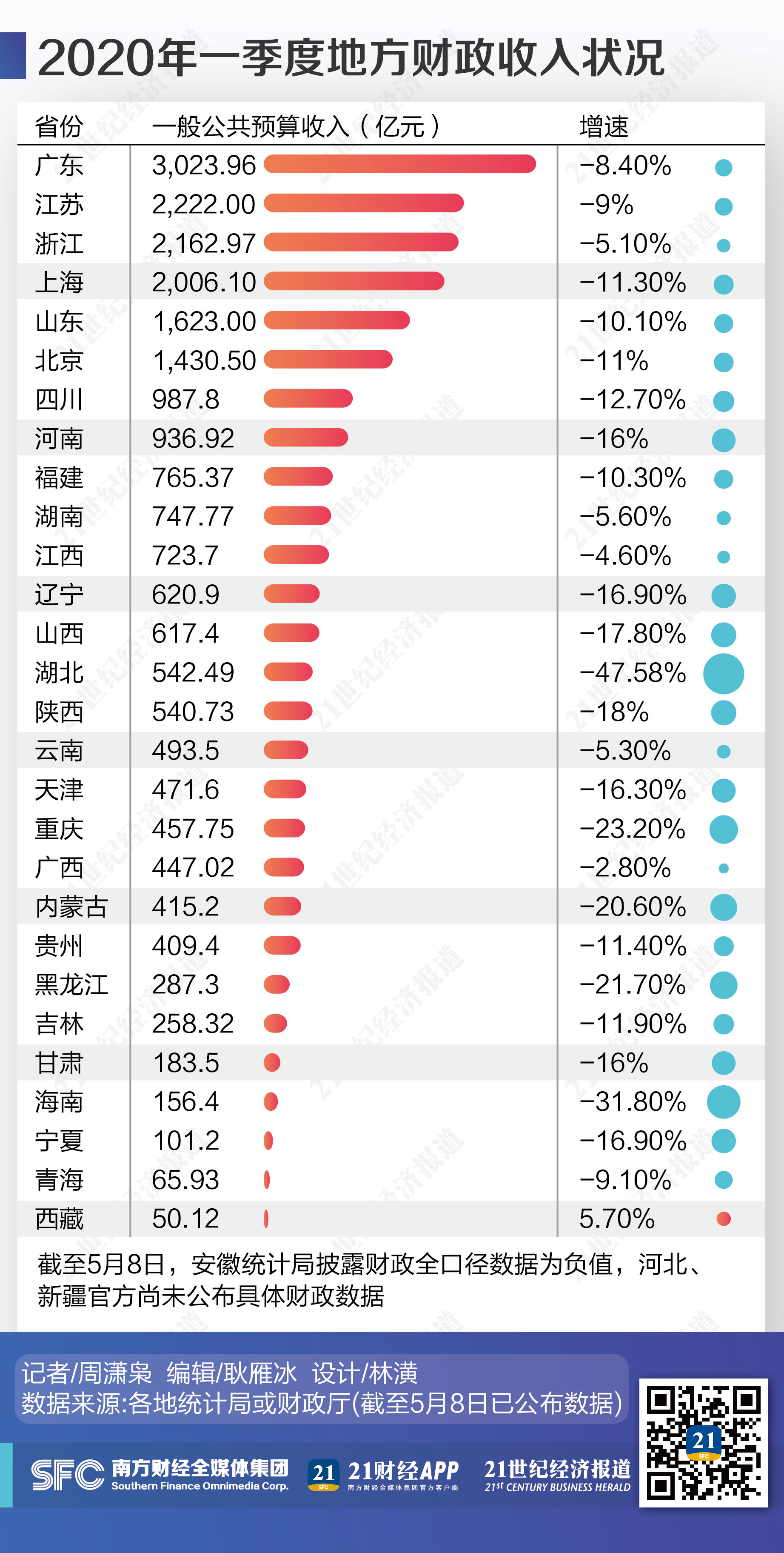 截至5月8日,从官方披露数据来看,一季度有28个省份财政收入负增长,目前仅西藏正增长,河北、新疆尚未披露具体财政数据。