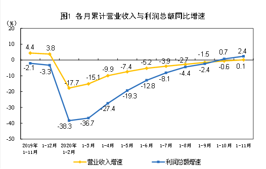 1—11月份,全国规模以上工业企业实现利润总额57445.0亿元,同比增长2.4%(按可比口径计算,详见附注二),增速比1—10月份提高1.7个百分点。