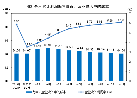 1—11月份,规模以上工业企业每百元营业收入中的成本为84.08元,同比减少0.01元;每百元营业收入中的费用为8.92元,同比增加0.12元。