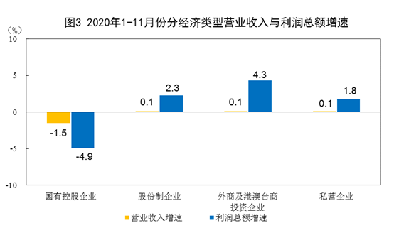 1—11月份,规模以上工业企业中,国有控股企业实现利润总额14456.9亿元,同比下降4.9%;股份制企业实现利润总额40580.1亿元,增长2.3%;外商及港澳台商投资企业实现利润总额16105.2亿元,增长4.3%;私营企业实现利润总额17332.2亿元,增长1.8%。
