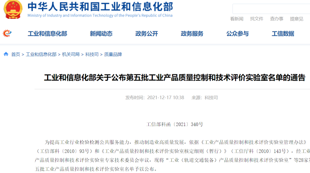 为提高工业行业检验检测公共服务能力,推动制造业高质量发展,依据《工业产品质量控制和技术评价实验室管理办法》(工信部科〔2010〕93号)和《工业产品质量控制和技术评价实验室核定细则(暂行)》(工信厅科〔2010〕143号),经工业产品质量控制和技术评价实验室专家技术委员会审议,工信部公布了第五批工业产品质量控制和技术评价实验室名单。第五批实验室共28家,涵盖装备、建材、石化、钢铁、有色、轻工、食品、电子信息等领域。