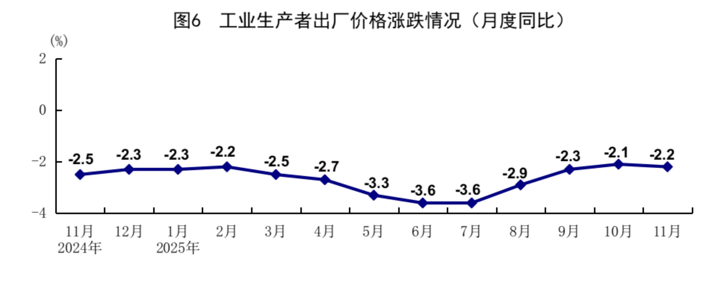 11月份,全国工业生产者出厂价格同比下降2.2%,环比上涨0.1%;全国工业生产者购进价格同比下降2.5%,环比上涨0.1%1-11月份,全国工业生产者出厂价格和购进价格同比分别下降2.7%3.1%