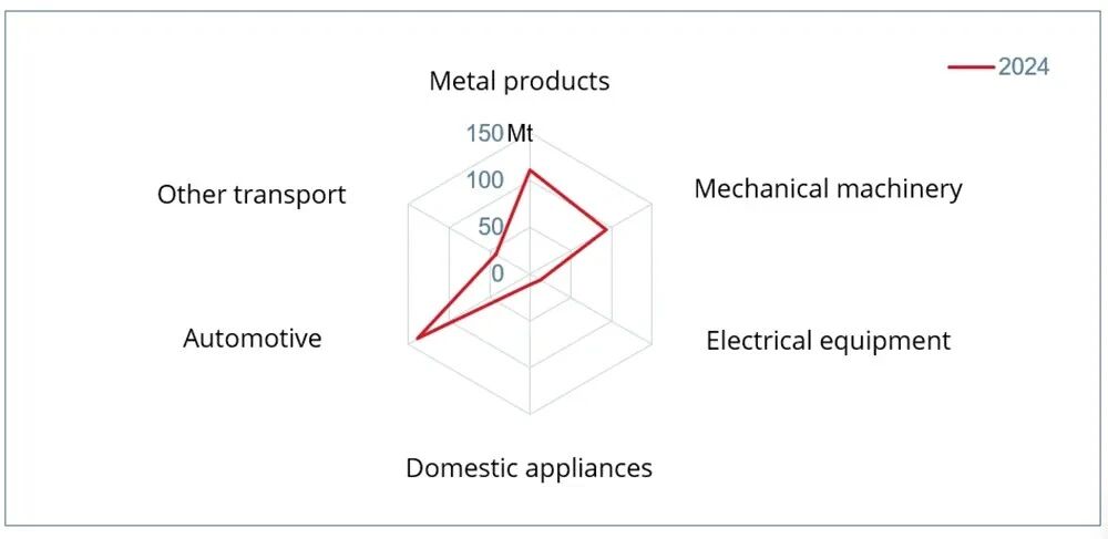 按行业划分的钢铁间接出口量(单位:百万吨(Mt),折合成成品钢量)