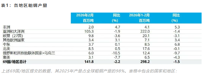 2026年2月全球69个纳入世界钢铁协会统计国家/地区的粗钢产量为1.418亿吨,同比下降2.2%。