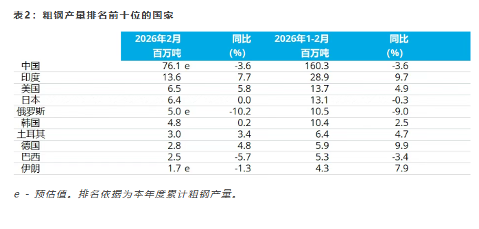 2026年2月,中国粗钢预估产量为7609万吨,同比下降3.6%;